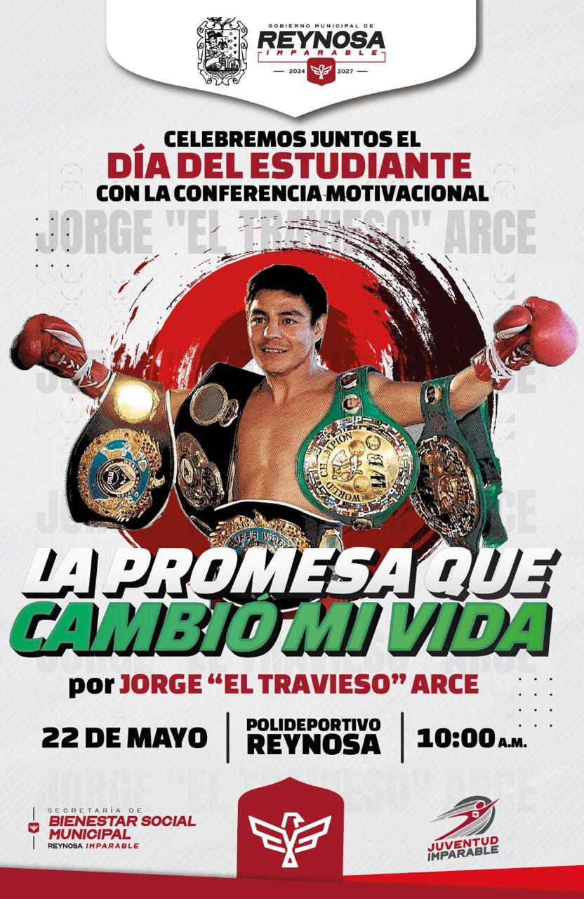 Celebremos Juntos el Día del Estudiante con la Conferencia Motivacional «La Promesa que Cambió mi Vida», el Alcalde Carlos Peña Ortiz invita a todos los jóvenes estudiantes a escuchar a Jorge «El Travieso» Arce el próximo 22 de mayo a las 10:00 A. M. en el Polideportivo Reynosa.
