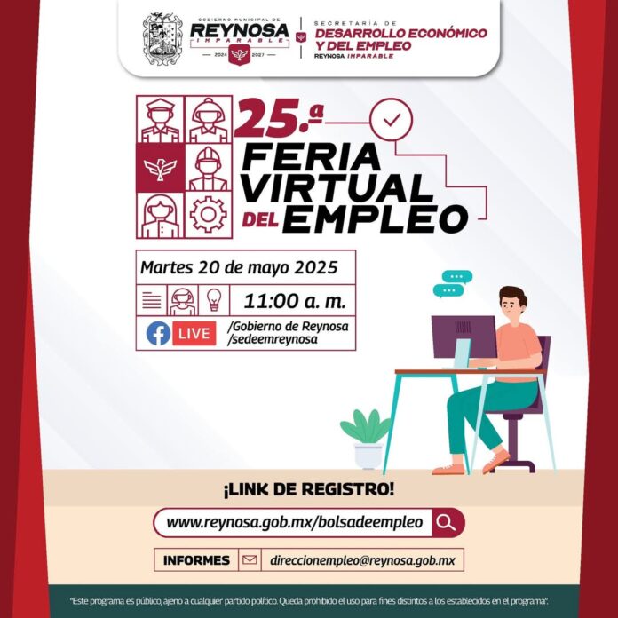 El Gobierno Municipal del Alcalde Carlos Peña Ortiz te invita a la 25ª Feria Virtual del Empleo, a celebrarse este martes 20 de mayo a partir de las 11:00 de la mañana, vía Facebook Live desde la página de la Secretaría de Desarrollo Económico y del Empleo de Reynosa.