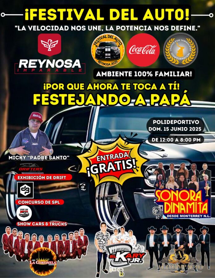 El Alcalde Carlos Peña Ortiz, te invita a disfrutar ¡GRATIS! el Festival del Auto Reynosa 2025, celebrando el Día del Padre, este domingo 15 de junio a partir de las 12:00 del medio día, hasta las 8:00 de la noche, en el estacionamiento del Polideportivo.