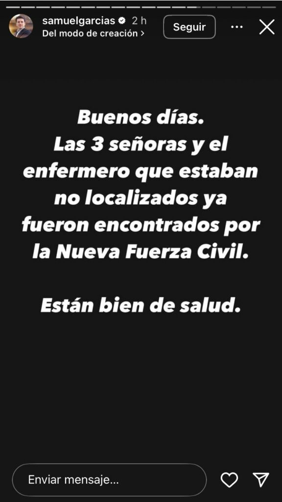 El jefe del ejecutivo estatal, Samuel García, anunció mediante redes sociales la ubicación exitosa de cuatro individuos que habían sido reportados como desaparecidos en territorio neoleonés. Según informó, agentes de la Nueva Fuerza Civil lograron localizar a las víctimas en condiciones físicas aceptables.