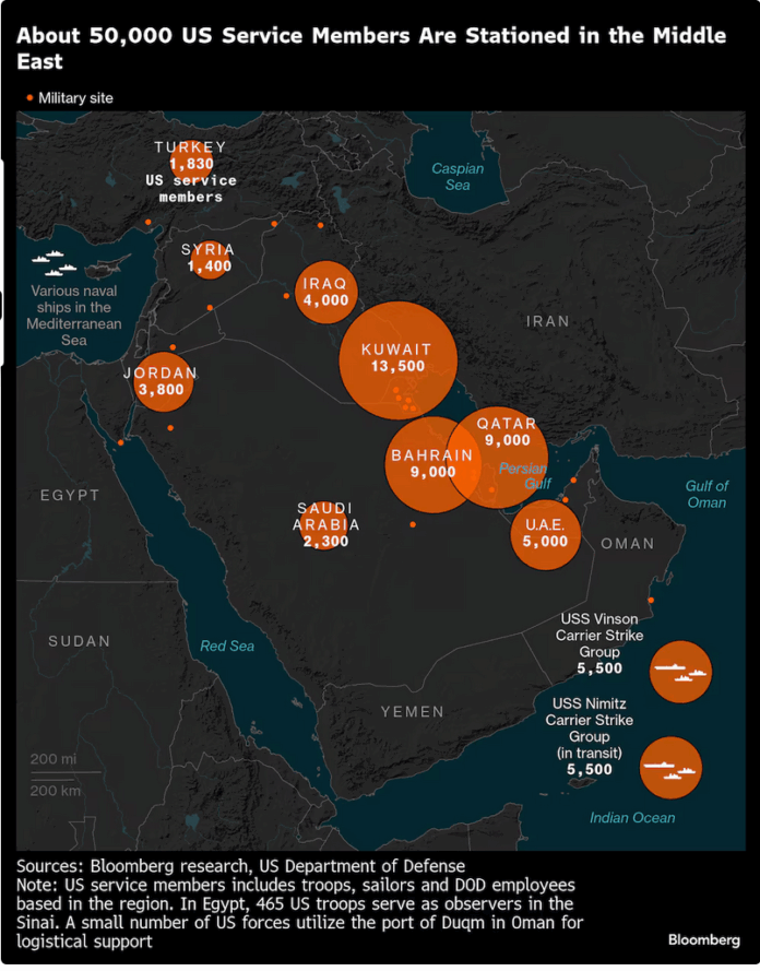 El conflicto podría generar ataques contra activos estadounidenses en la región, donde hay aproximadamente 50,000 miembros del ejército desplegados en Kuwait, Qatar, Bahréin, Emiratos Árabes Unidos, Irak y Arabia Saudí.