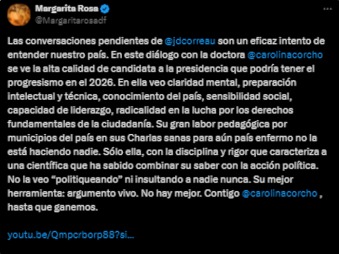 La reconocida actriz y presentadora colombiana Margarita Rosa de Francisco ha manifestado su respaldo explícito hacia Carolina Corcho como posible candidata a la presidencia de Colombia en las elecciones de 2026. En sus redes sociales, De Francisco destacó las cualidades de la exministra de Salud, expresando: