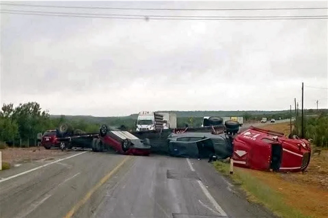 Un camión nodriza que transportaba unidades automotrices recién fabricadas sufrió un accidente tipo volcadura en el municipio de Sabinas Hidalgo, Nuevo León, bloqueando completamente la circulación por la carretera libre con dirección a Nuevo Laredo.