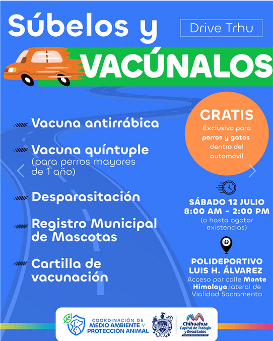 El Ayuntamiento de Chihuahua ha convocado a una campaña de salud animal que permitirá a los dueños de mascotas recibir servicios veterinarios básicos sin salir de sus automóviles. Este evento denominado «Súbelos y vacúnalos» se desarrollará en formato de atención exprés el próximo sábado 12 de julio, durante el horario matutino de 8:00 a 14:00 horas.