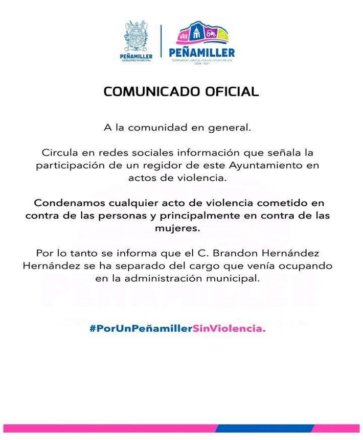 Brandon Hernández Hernández, ex regidor del municipio de Peñamiller, fue destituido de su posición luego de que un video subido a redes sociales mostrara una agresión física directa por parte del ahora ex funcionario contra una mujer. Los hechos ocurrieron el viernes anterior a la publicación de la información.