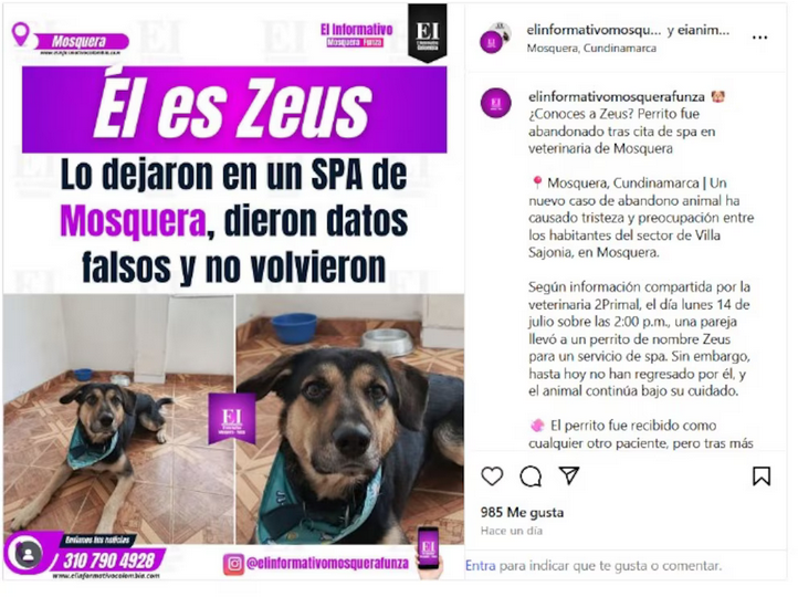 Un can de temperamento apacible identificado como Zeus fue entregado en un centro veterinario de Mosquera el lunes 14 de julio a las 14:00 horas, bajo circunstancias que han generado preocupación en el sector. Tras transcurrir más de un día sin comunicación de los presuntos tutores, el personal del establecimiento 2Primal sospecha que el animal fue deliberadamente dejado atrás. La institución detalló que el perro fue recibido con normalidad, como cualquier otro caso clínico.