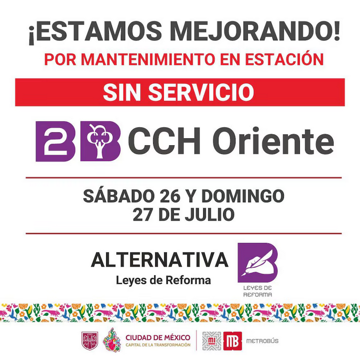 «Aviso importante. La estación CCH Oriente de Línea 2, por trabajos de mantenimiento, permanecerá sin servicio el sábado 26 y domingo 27 de julio»