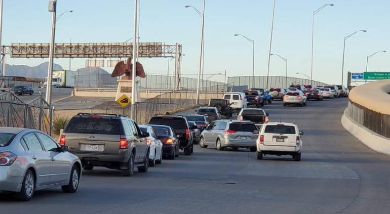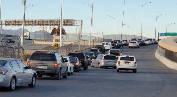 En el paso de Zaragoza-Ysleta, los conductores comienzan a formarse desde muy temprano, extendiéndose desde la Plaza Waterfill hasta cercanías de la caseta de cobro, con un avance parcial sobre el puente.