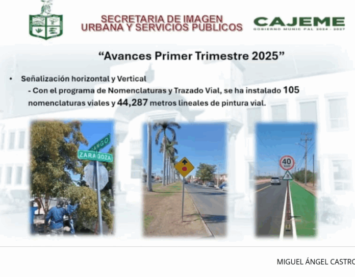 En materia de vialidades, se ha intervenido en 1,334,300 metros cuadrados de caminos de tierra, eliminado 29,190 metros cúbicos de escombros y realizado 44,945 metros cuadrados de reparaciones asfálticas distribuidas en 49 colonias. Otros trabajos incluyen la colocación de 105 señales viales, aplicación de 44,287 metros lineales de demarcación, ajuste de 202 semáforos, restauración de 32 rejillas pluviales y limpieza de 118 sumideros.