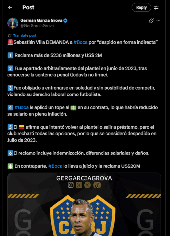 Según información difundida ese día por el periodista Germán García Grova del canal TyC Sports, el deportista acusa al club de violar su contrato laboral mediante una separación encubierta. El reportero explicó que «Sebastián Villa DEMANDA a Boca por ‘despido en forma indirecta’ Reclama más de $236 millones de pesos argentinos y US$ 2M Fue apartado arbitrariamente del plantel en junio de 2023, tras conocerse la sentencia penal (todavía no firme). Fue obligado a entrenarse en soledad y sin posibilidad de competir, violando su derecho laboral como futbolista. Boca le aplicó un tope en su contrato, lo que habría reducido su salario en plena inflación. Él afirma que intentó volver al plantel o salir a préstamo, pero el club rechazó todas las opciones, por lo que se consideró despedido en julio de 2023. El reclamo incluye indemnización, diferencias salariales y daños».