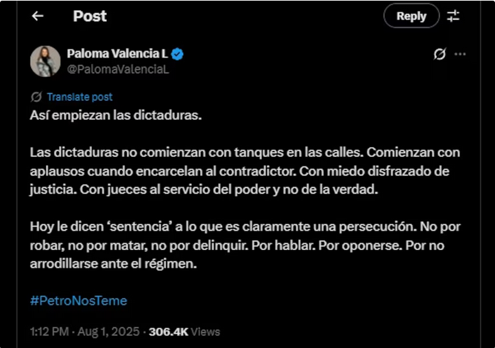 La senadora Paloma Valencia, representante del Centro Democrático, emitió una publicación en la plataforma X donde afirmaba: «Así empiezan las dictaduras. Las dictaduras no comienzan con tanques en las calles. Comienzan con aplausos cuando encarcelan al contradictor. Con miedo disfrazado de justicia. Con jueces al servicio del poder y no de la verdad». La legisladora también cuestionó la imparcialidad del proceso judicial, afirmando que «hoy le dicen ‘sentencia’ a lo que es claramente una persecución. No por robar, no por matar, no por delinquir. Por hablar. Por oponerse. Por no arrodillarse ante el régimen».