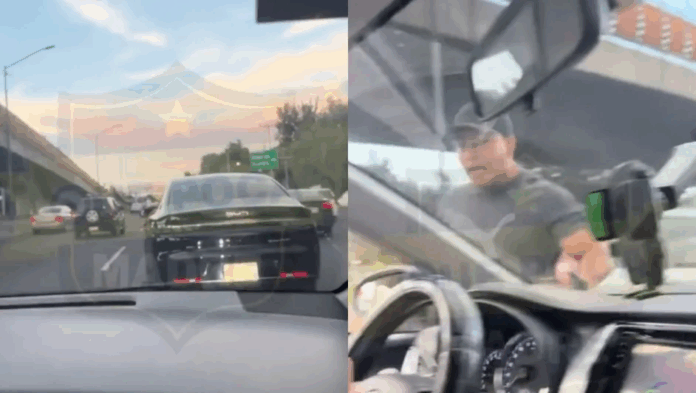 El video grabado por la acompañante del vehículo afectado muestra ambos automóviles circulando por el carril central. En determinado momento, el automóvil negro con placas 34G-986 realiza una maniobra brusca que obliga a detenerse de manera abrupta al coche que circulaba detrás, quien responde accionando la bocina.