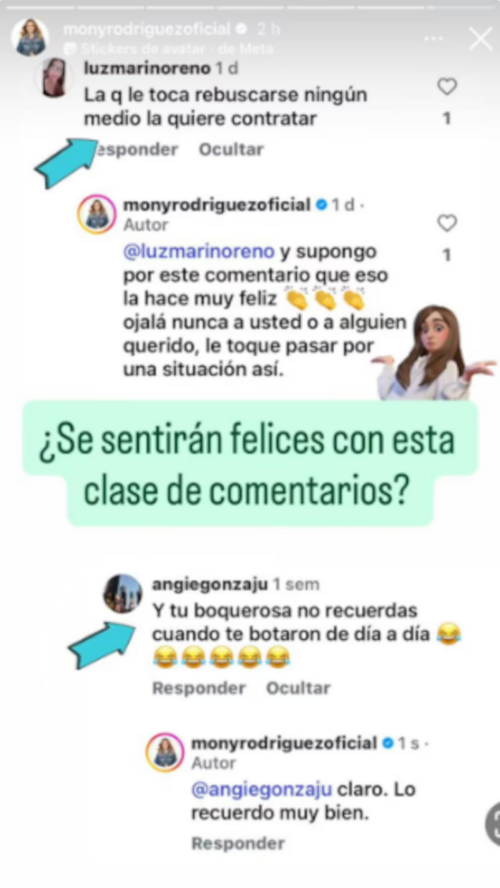 Mediante publicaciones en sus redes sociales, la comunicadora compartió capturas de las críticas recibidas. Frente a comentarios sobre su situación laboral actual, escribió: