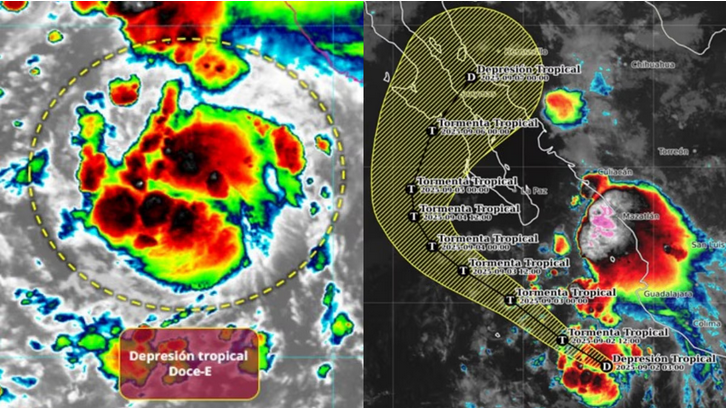 La Comisión Nacional del Agua (Conagua) reportó la formación de la depresión tropical Doce-E en el Pacífico, la cual podría transformarse en la tormenta tropical ‘Lorena’, generando condiciones climáticas adversas en diversas regiones del país. El fenómeno se desarrolló durante la madrugada del martes 2 de septiembre y actualmente se encuentra posicionado a 345 kilómetros al oeste-suroeste de Manzanillo, Colima, y a 330 km al sur-suroeste de Cabo Corrientes, Jalisco.