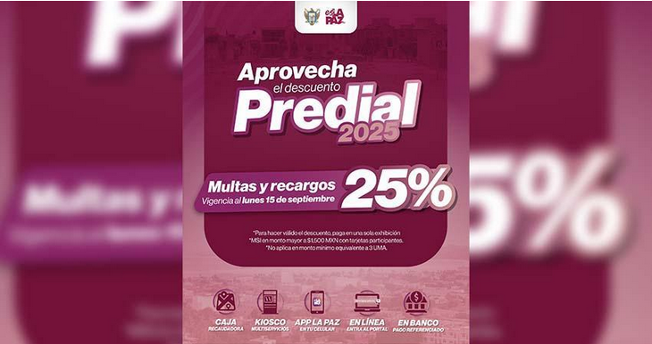 El Ayuntamiento de La Paz ha extendido el beneficio del 25% de reducción en sanciones y cargos adicionales del impuesto predial correspondiente al año en curso y períodos anteriores, con vigencia hasta el día 15 de septiembre, según dio a conocer el titular de la Tesorería Municipal, Jassiel Enríquez Varela.