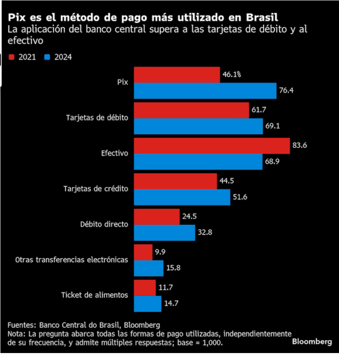 Lanzado en 2020 durante la pandemia, Pix alcanzó una rápida adopción masiva con aproximadamente 160 millones de usuarios activos mensuales en un país de 210 millones de habitantes. El sistema permite transferencias sin comisiones ni intermediarios, convirtiéndose en el método de pago más utilizado en Brasil.