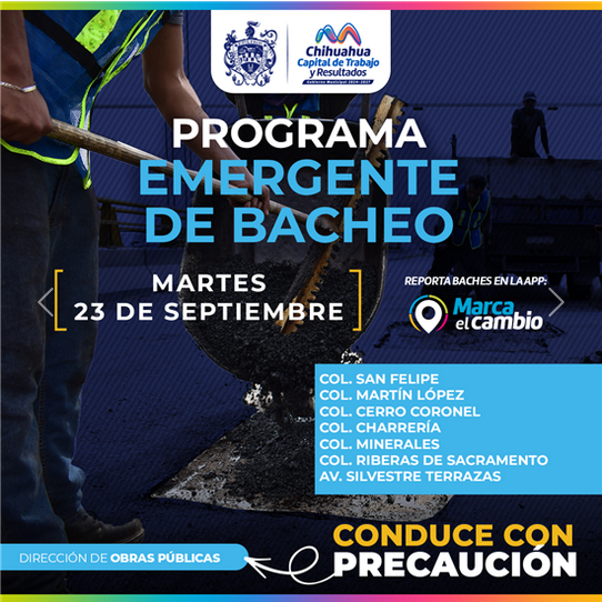 La Dirección de Obras Públicas del Ayuntamiento de Chihuahua ejecutará labores de reparación de vías durante el martes 23 de septiembre, según informó la administración local. Las acciones se concentrarán en diversos puntos de la ciudad incluyendo las colonias San Felipe, Martín López, Cerro Coronel, Charrería, Minerales y Riberas del Sacramento, así como en la avenida Silvestre Terrazas.
