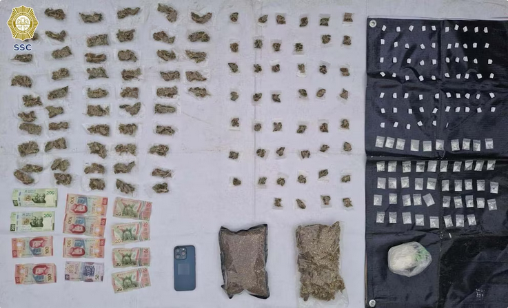 Durante la intervención policial, efectivos de la Secretaría de Seguridad Ciudadana encontraron al sospechoso manipulando una bolsa que contenía sustancias ilícitas. Tras una revisión, hallaron 101 bolsas con hierba verde, 300 gramos de marihuana suelta, 63 envoltorios con aparente cocaína, 48 bolsas adicionales con la misma sustancia, una porción de posible cristal, un teléfono celular y efectivo en moneda nacional. Estos elementos fueron asegurados por las autoridades.
