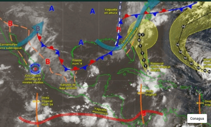El cuarto frente frío de la temporada se posicionará desde el golfo de México hasta el centro del estado de Veracruz, provocando «lluvias fuertes a muy fuertes en las zonas noreste y oriental del país», informaron las autoridades climatológicas. Paralelamente, canales de baja presión en el interior nacional y la constante inestabilidad atmosférica originarán precipitaciones abundantes en múltiples regiones.