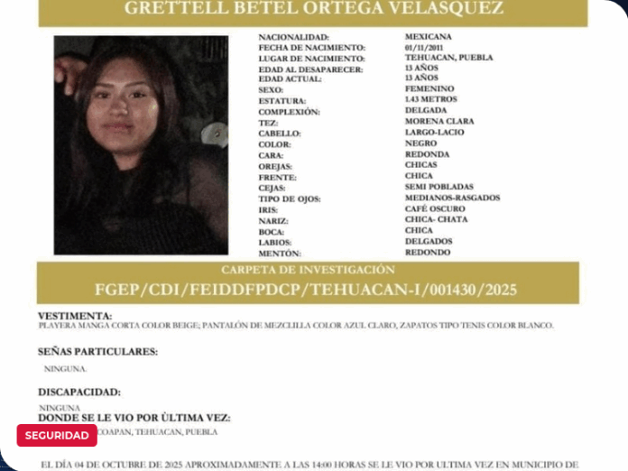 Se ha activado un operativo de búsqueda para dar con el paradero de Grettell Betel Ortega Velasquez, una joven de 13 años originaria de Tehuacán, Puebla, quien fue vista por última vez en la comunidad de Santa María Coapan. La menor fue reportada como no localizada desde el sábado 4 de octubre de este año, alrededor de las 14:00 horas.