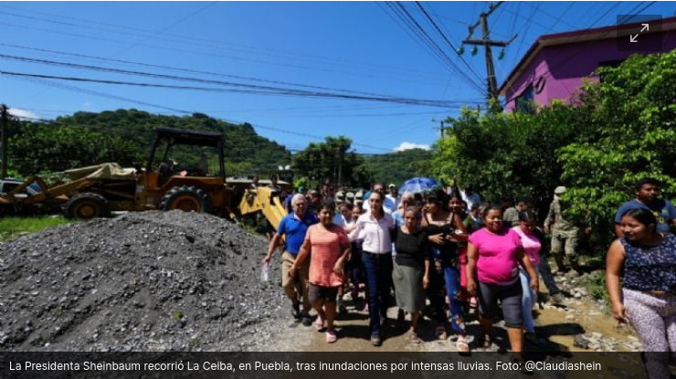 La presidenta Claudia Sheinbaum recorrió este domingo zonas afectadas por fuertes lluvias en Puebla, como La Ceiba y Huauchinango, comunidades severamente impactadas por inundaciones, y desde ahí anunció que se realizará un censo para entregar apoyos de forma inmediata a quienes resultaron afectados.