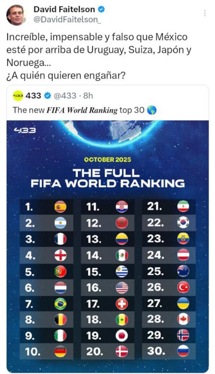 Mediante su cuenta de X, el periodista de TUDN expresó su desacuerdo con el lugar que ocupa México, señalando que no merece estar por encima de selecciones como Uruguay, Suiza, Japón o Noruega.