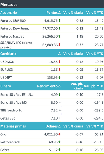 Los futuros de los principales índices bursátiles en Estados Unidos avanzan, con el enfoque puesto en la temporada de reportes empresariales, donde el crecimiento promedio en utilidades alcanza un 12.5% entre las compañías del S&P 500. En contraste, las bolsas europeas retroceden ligeramente, con el Euro Stoxx 50 en territorio negativo (-0.2%).