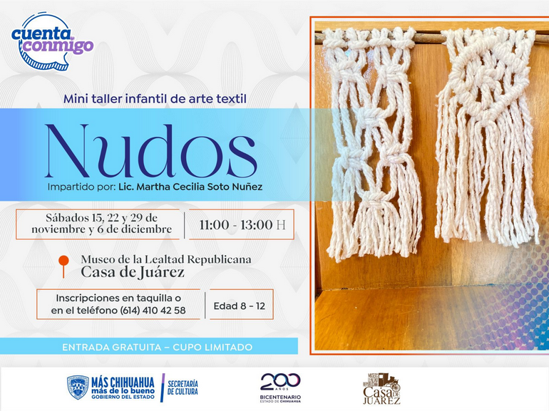 El Museo Casa Juárez ha extendido una invitación dirigida especialmente a niños entre 8 y 12 años para que tomen parte en un mini taller creativo denominado «Nudos», enfocado en el arte textil y la elaboración de adornos con técnicas basadas en el macramé.
