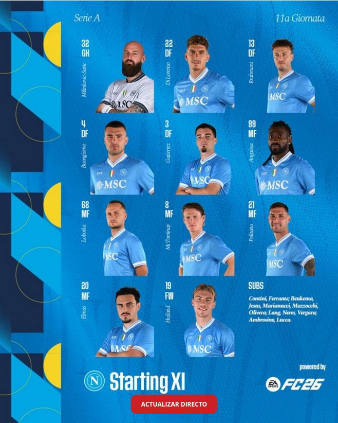 El escenario es el icónico Estadio Renato Dall’Ara, con césped en óptimas condiciones y un ambiente cargado de pasión. Las alineaciones reflejan los estilos contrarios: el Napoli apuesta por un once ofensivo con posesión y transiciones rápidas, mientras el Bolonia prioriza solidez defensiva y presión alta.