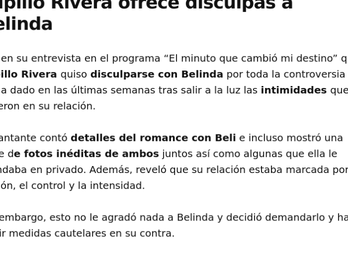 Durante su participación en el espacio televisivo “El minuto que cambió mi destino”, Rivera manifestó su deseo de enmendar el daño emocional que pudo haber causado. Aunque reveló aspectos íntimos de su vínculo con Belinda y mostró imágenes privadas, aseguró que no fue su intención herirla.