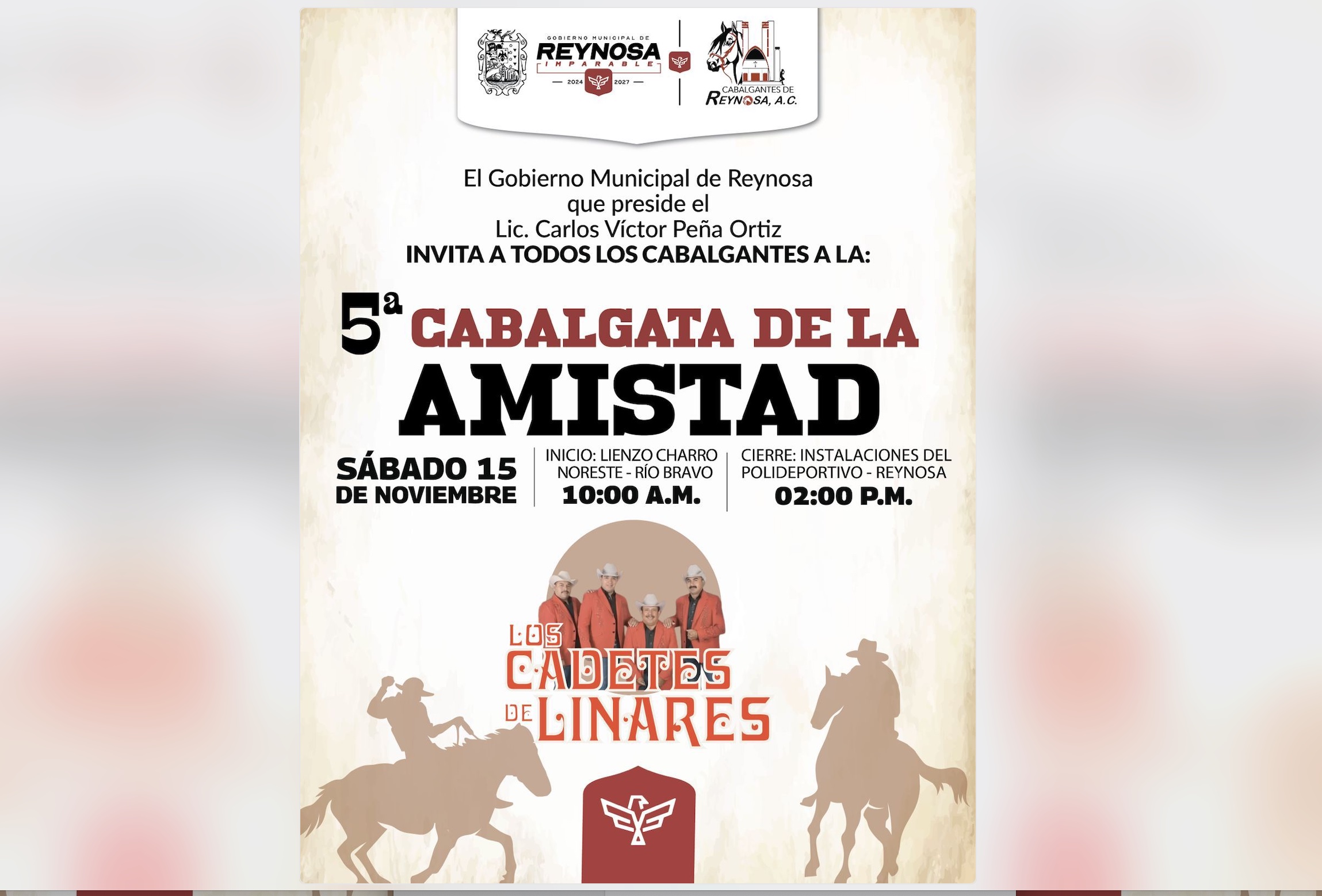 El Gobierno Municipal de Reynosa, que encabeza el Alcalde Carlos Peña Ortiz, invita a todas y todos los cabalgantes a la Quinta Edición de la Cabalgata de la Amistad, celebrando la tradición y el orgullo del Norte de Tamaulipas.