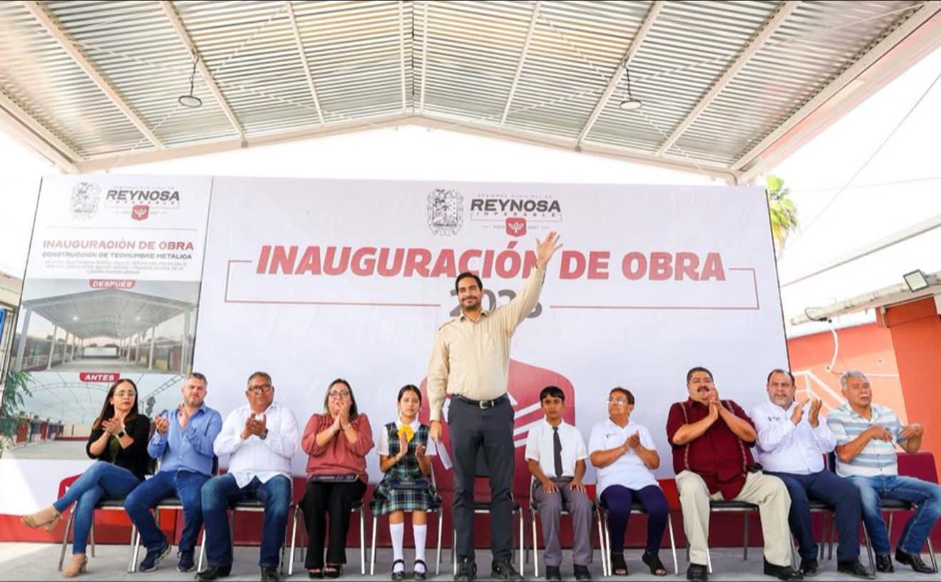 Inaugurando la Techumbre Metálica en la escuela primaria Aquiles Serdán, de la colonia Rancho Grande, el Presidente Municipal Carlos Peña Ortiz, fue recibido por la Directora Wendy Roxana Castro Lores y los alumnos Briana Camila González Cruz y David Alarcón Rincón.