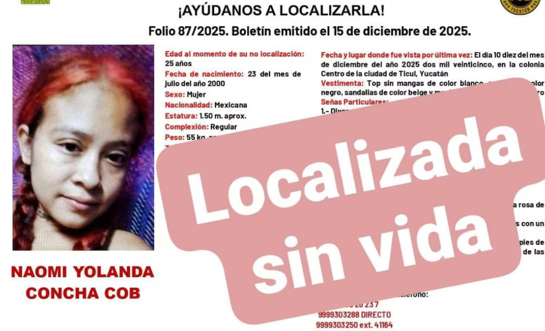 En el municipio de Ticul, Yucatán, fue encontrado el cuerpo sin vida de Naomi Yolanda Concha Cob, joven que había sido reportada como desaparecida desde el 10 de diciembre. El hallazgo se produjo en una zona de brecha con abundante vegetación, en el camino que une Ticul con Santa Elena, cercano al relleno sanitario local.