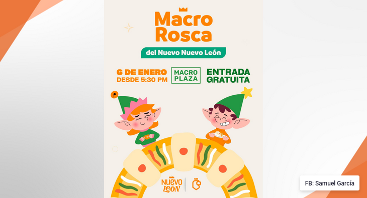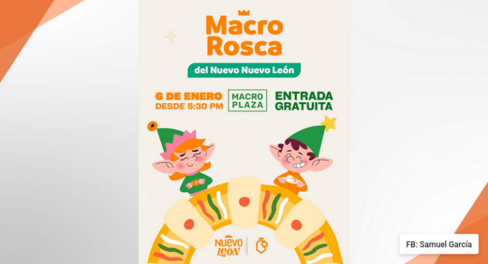 “¡Arranquemos el año nuevo con la tradicional Macrorosca! Este 6 de enero, a partir de las 5:30, dénse la vuelta con toda la familia a la Macroplaza por su chocolate caliente y su pedazo de rosca. Y a quien le toque monito, se llevará una gran sorpresa. ¡Los esperamos!”