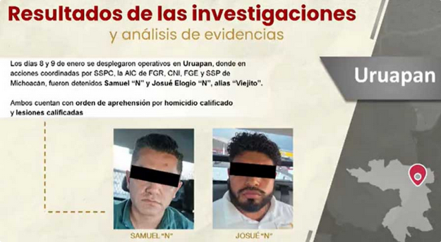 En operativos realizados entre el 8 y 9 de enero en Uruapan, autoridades detuvieron a Samuel «N» y a Josué Elogio «N», alias «Viejito», por su posible participación en el asesinato de Carlos Manzo, presidente municipal de ese municipio. Ambos cuentan con órdenes judiciales por homicidio calificado y lesiones calificadas.