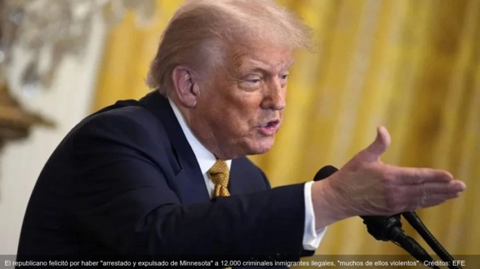 El presidente elogió a los agentes del Servicio de Inmigración y Control de Aduanas (ICE), a quienes calificó de patriotas, y los felicitó por haber arrestado y expulsado de Minnesota a 12,000 inmigrantes ilegales con antecedentes penales, muchos de ellos violentos.