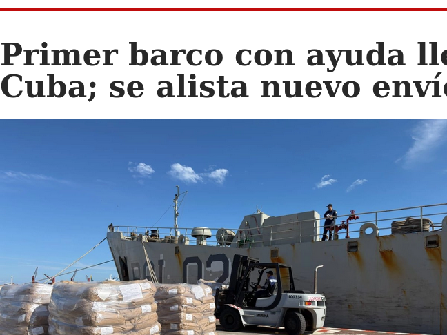 La presidenta Claudia Sheinbaum informó que este miércoles arribó a Cuba el primer barco de la Secretaría de Marina con ayuda humanitaria enviada por el gobierno de México. Durante la conferencia matutina, señaló que la embarcación regresará al país, donde ya se encuentra en preparación un segundo cargamento para ser enviado a la isla caribeña.