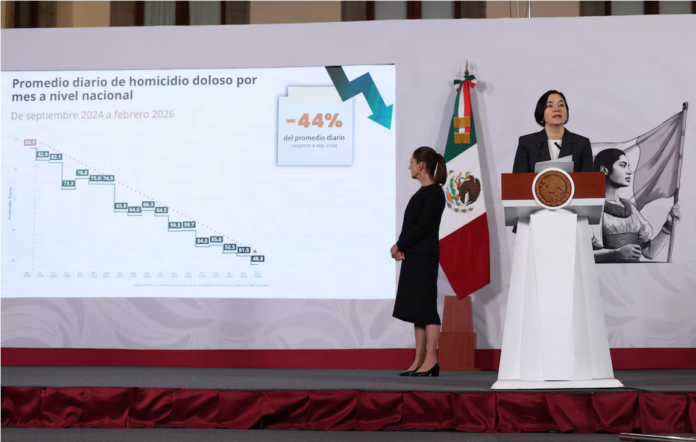 Marcela Figueroa Franco, encargada del Secretariado Ejecutivo del Sistema Nacional de Seguridad Pública, informó que el promedio diario de homicidios dolosos disminuyó un 35% entre 2025 y 2026. En febrero de este año, el país no superó las 50 muertes violentas diarias, frente a las 75 registradas en el mismo mes del año anterior.