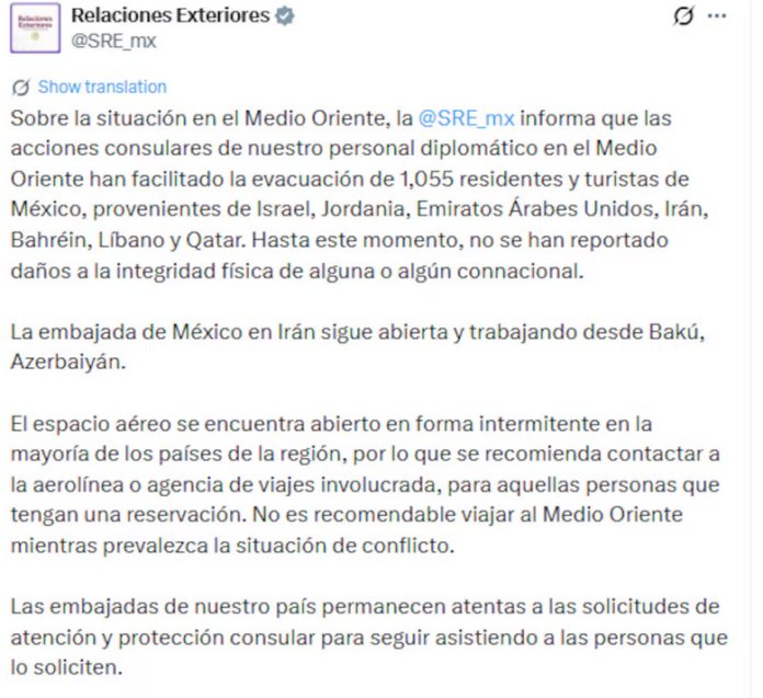 «El llamado de la SRE es a mantenerse informados y evitar traslados hacia el Medio Oriente hasta que la situación permita garantizar la seguridad de los ciudadanos mexicanos.»