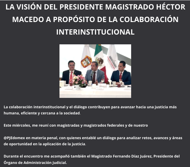El fortalecimiento de la justicia en la entidad se impulsa mediante el diálogo constante y la cooperación entre instancias judiciales. El Presidente Magistrado del Poder Judicial del Estado de México, Héctor Macedo, sostuvo un encuentro con magistradas y magistrados federales y locales especializados en materia penal, con el fin de revisar los avances, desafíos y oportunidades de mejora en la impartición de justicia.