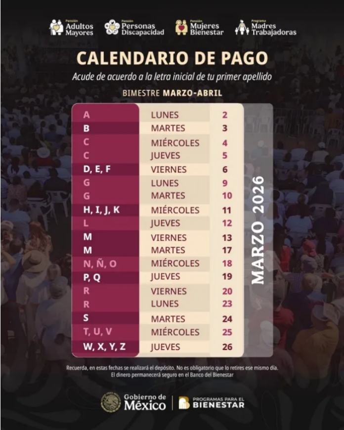 El pago se realiza de forma escalonada según la primera letra del primer apellido del beneficiario. Durante la primera semana de marzo, los depósitos comenzaron con quienes tienen apellidos que inician con A, el lunes 2, y continuaron de forma progresiva. Para el caso del miércoles 18, es el turno de quienes llevan N, Ñ y O. Las siguientes fechas incluyen P y Q (jueves 19), R (viernes 20 y lunes 23), S (martes 24), T, U, V (miércoles 25) y finalmente W, X, Y, Z (jueves 26).
