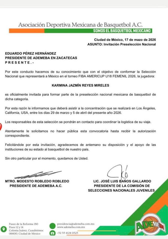 La basquetbolista zacatecana Karmina Jazmín Reyes Mireles fue convocada a la preselección nacional mexicana U-18 femenil, como parte del proceso de selección para el torneo FIBA AmeriCup 2026. La jugadora deberá asistir a una concentración del 29 de marzo al 5 de abril en Los Ángeles, California, convocada por la Asociación Deportiva Mexicana de Basquetbol (Ademeba), donde será evaluada para integrar el roster definitivo del equipo nacional.